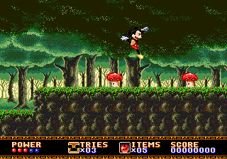 Sendo um jogo de plataforma, Mickey é capaz de saltar e atacar, mas de forma bem diferente: além dos itens encontrados nas fases, Mickey pode dar bundadas nos inimigos, um tipo de ataque, digamos, um pouco doloroso. Mario, pelo menos, pisava nos inimigos, ao invés de sentar, embora que a partir do Super Mario 64 ele também adquiriu esse costume…