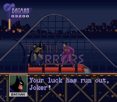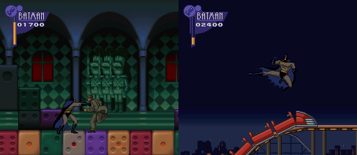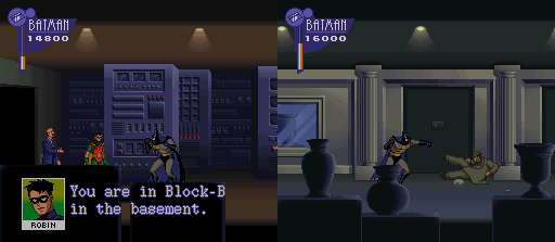 Se existe um jogo do Batman que me deixa com raiva é esse Adventures of Batman & Robin do SNES. Não por ele ser ruim, longe disso. O problema é que o game é difícil pacas pra quem mal o conhece. Nada aqui é feito pra te ajudar, as fases possuem muitas armadilhas, os inimigos sacam armas sem avisar e os chefes tem um esquema certo para serem derrotados. Até aprender tudo, lá se vão muitas vidas, continues e a paciência dos mais apressados.