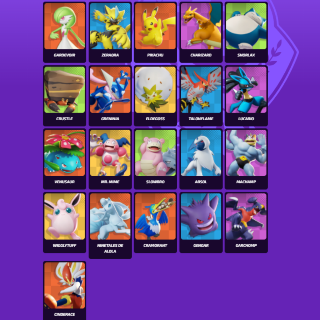 E quem são os Pokémon iniciais do game?  No lançamento eram 20 Pokémon disponíveis, mas outros estão a caminho e continuarão sendo adicionados. Os 20 primeiros são: Absol; Blastoise; Blissey; Charizard; Scorbunny; Cramorant; Crustle; Eldegoss; Garchomp; Gardevoir; Gengar; Greninja; Lucario; Machamp; Mr. Mime; Ninetales (Alolan); Pikachu; Slowbro; Snorlax; Talonflame; Venusaur;Wigglytuff; e Zeraora. Além disso, os Pokémon são de diferentes grupos. Temos os supporter, all-rounder, attacker,defender e speedster.